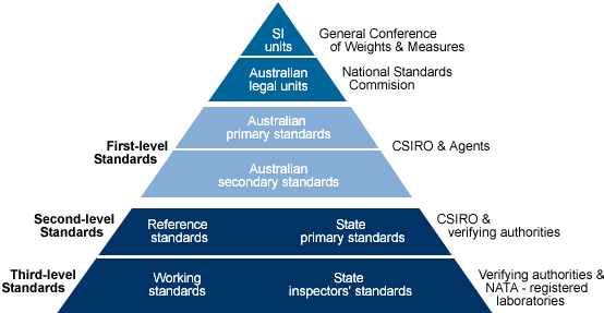 At the top of the pyramid is the International System of units (SI units) which was adopted by international agreement at the General Conference of Weights and Measures in 1960. SI units form the basis of Australia's hierarchy of standards. SI base units of measurement, derived and supplementary units and combinations of these units are prescribed by the National Measurement Act as the sole legal units for the measurement of all physical quantities in Australia. Legal metrology comprises all measurement carried out for legal purpose. It includes all measurement that is subject to regulation by law or government decree such as measurement for traffic control, occupational health and safety and environmental monitoring. It also encompasses trade measurement. Australia is a member of the International Organisation of Legal Metrology (OIML). OIML is responsible for developing model regulations in the fields of legal metrology and practical measurements. The National Measurement Act requires CSIRO or its agents to maintain such standards of measurement that are necessary to provide means for measurements of physical quantities to be made in terms of the legal units. Australian primary and secondary standards are maintained by CSIRO and its agents and these are used to calibrate State primary standards and reference standards, which in turn are used to calibrate inspectors' standards and working standards. Section 10 of the National Measurement Act establishes the requirement for legal traceability to the national standards of measurement. Legal traceability is demonstrated through Regulation 13 certificates issued by verifying authorities. Through their calibration services CSIRO and its agents provide metrological traceability to the national standards of measurements. Where legal traceability is required a Regulation 13 certificate should be issued.